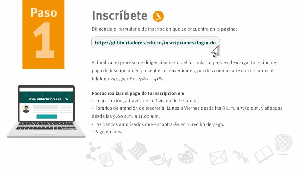 Consulta tu programa de interés. Para más información, consulta telefónicamente al PBX. 2544750, opción 1. Adicional, podemos responder tus preguntas por medio del correo electrónico: infovirtual@libertadores.edu.co, donde un promotor pueda atenderte.